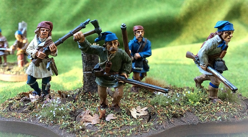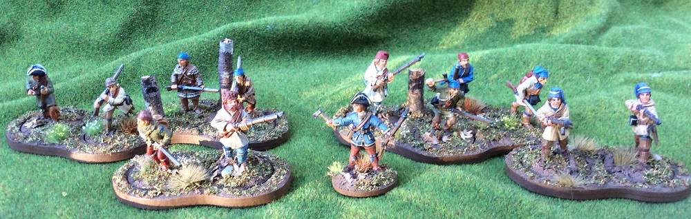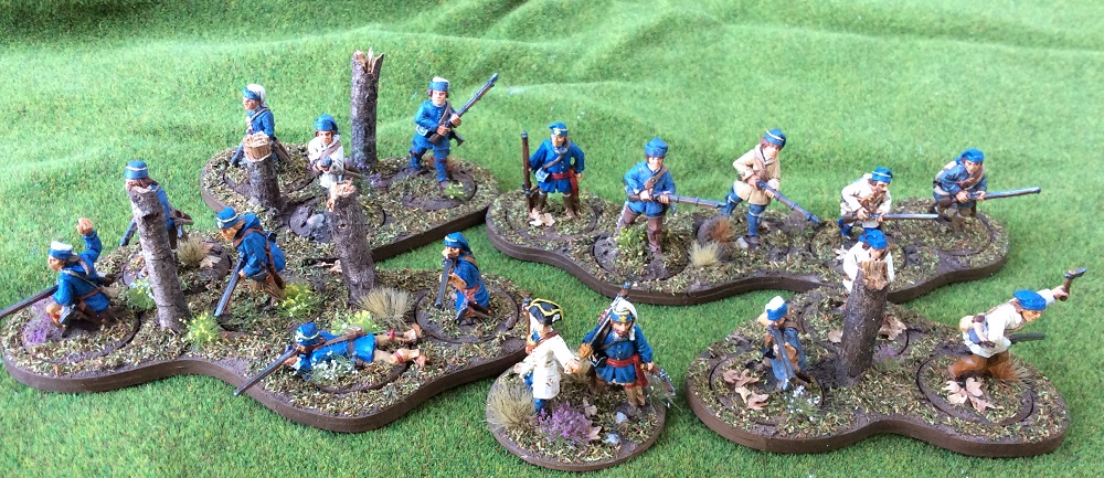 The basic core force consists of two units of eight Compagnie Franches de la Marine, under a senior officer, two units of six Canadian militia, with an officer and two units of 12 native Americans, with a leader. Northstar produce a very nice French Wilderness force box set for Muskets and Tomahawks, which combined with a box each of Compagnie Franches de la Marine and Woodland Indians from Warlord Games (actually Conquest Miniatures) gives you exactly what you need, with six figures left over to serve as a unit of Coureur de Bois and an additional sergeant. There is a slight size difference between Northstar and Warlord, but they mix together perfectly well, in my view.