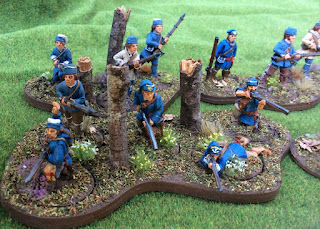 This post features the two units of Compagnie Franches de la Marine. The movement based are from , and I have gone for a woodlands theme with the basing. The tree trunks are a compromise - I wanted to evoke woods without having to move whole forests around the table like Birnam Wood, but hopefully they don't look too much like Ypres. What do you reckon?
